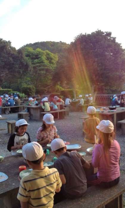 どのグループも協力しておいしいすき焼き風煮ができました。たそがれの海辺で食べる夕食が格別の味です。