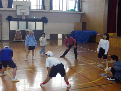 はじめに、フラフープ内に帽子を運ぶ「おはこびリレー」を何度も行いました。