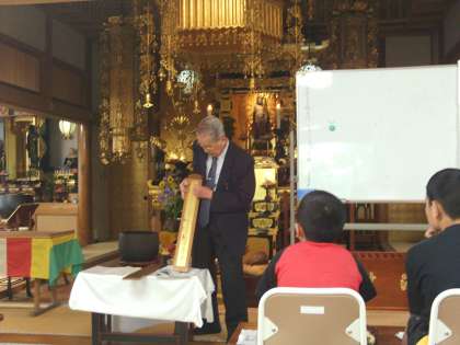 宝幢寺では、毛人(えみし)の墓から出土した墓誌のレプリカを見せていただきました。参観させていただく私たちのために席をご用意いただいたり、福本氏(上高野の自然と文化を学ぶ同史会会長)から説明していただいたりするなど、ご丁寧に応対していただきました。ありがとうございました。