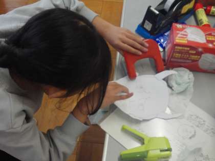 絵を描いて、目の部分をくり抜いて、輪ゴムをつけて.....。