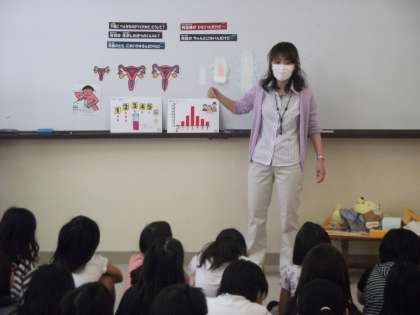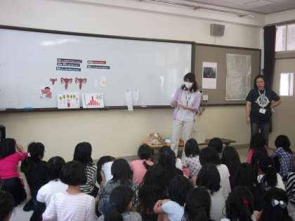 山の家の宿泊学習の前に、5年生女子が月経のしくみ・月経時の手当ての仕方・汚物の処理の仕方を学習しました。