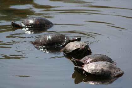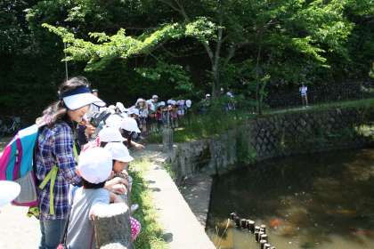 歩き始める前に子どもたちが素早く池の鯉を見つけました。たくさんの鯉が寄ってきてくれます。大はしゃぎで見ていると,今度はカメです。ポカポカ陽気で甲羅干しに杭の上にたくさんあがってきました。