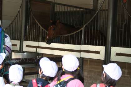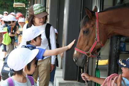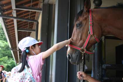 騎馬隊の方が,大文字くんを出してきてくださって一人一人触らせてくださいました。