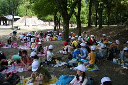 木陰を選んでお弁当をみんなで美味しく食べました。お弁当の後,おやつを食べて後片付けをして遊びタイムです。