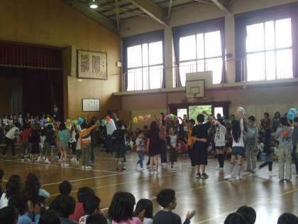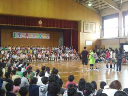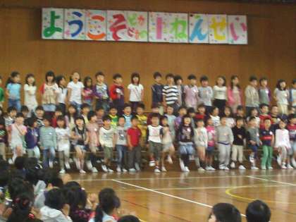 1年生が、6年生に手を引かれて入場してきました。初めに、児童会役員が「学校のきまり」をドラエモンの劇で表現しました。会場は笑いでいっぱいでした。そのあと、各学年の工夫した出し物が出され、修学院クイズに続き、最後は児童会の歌を全員で斉唱しました。