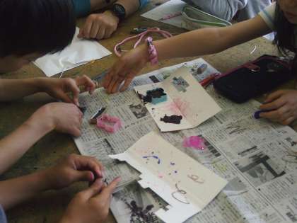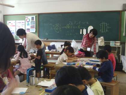 これは,京都造形大学の森田先生と学生による自由な自己表現を楽しむ造形活動です。本日,午前10時から「クレヨンをつくろう」というテーマで進められました。