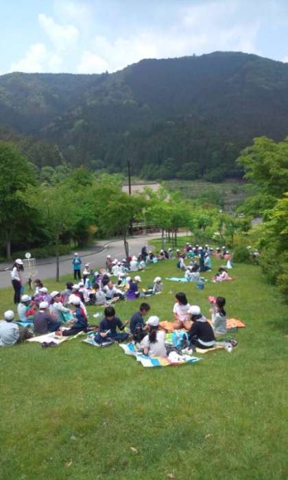 山の家に到着後,荷物を整理して,玄関前の広い芝生で昼食をたべました。午後からいよいよ本格的な活動がはじまります。