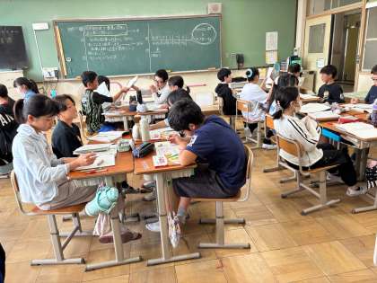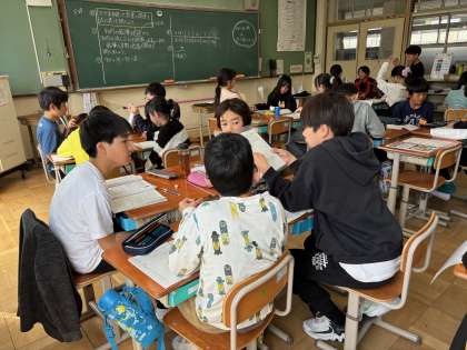 XやYを使った式に表して数量関係を調べました。文字を使い始めたのはつい先日のこと。まだ2回目ですが、すでに使いこなしている様子があり、わからないことがあっても友達同士でなんとか理解できるまで教え合う様子がありました。この単元も、力を合わせて乗り越えましょう!