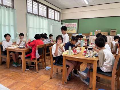 梅原先生に授業していただいた後は、ランチルームでの給食!年に数回の貴重な機会。いつもと違う雰囲気が楽しそうでした。