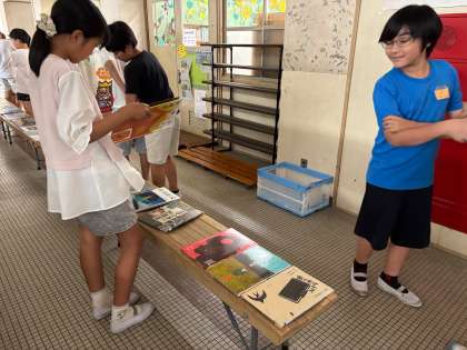 もうすぐ国語科で「やまなし」の学習に入ります。それに伴って、6年生の教室の前に「やまなし」の作者である宮沢賢治さんの作品を並べました。突然表れた本の数々に「何これ〜」と興味津々といった様子でした。