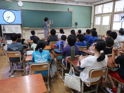 今日は、お話きらら隊の方による読み聞かせの日でした。今日のお話は「ホネホネどうぶつえん」。動物の骨について、子ども達からたくさんの「へぇ〜」や「そうなんだ」の声が上がっていました。「パンダには、本来の5本の指に加えて第六・第七の指と言われる骨がある」「へぇ〜」「キリンの首の骨の数は、実は人間と一緒」「へぇ〜」朝から楽しい時間を過ごすことができました。
