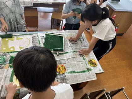この作品を作るにあたって、子どもたちは最後にどのような作品にしたいのか、どうほり進めるのか、何色から刷っていけばよいのかしっかりと考えて作成していました。