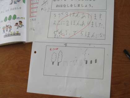 絵を見て,式にあうお話を作っています。「ぜんぶで」「くると」など,学習した言葉を使って子どもたちは文を書いています。これらは,「絵を読む力」や「式を読む力」につながっていきます。