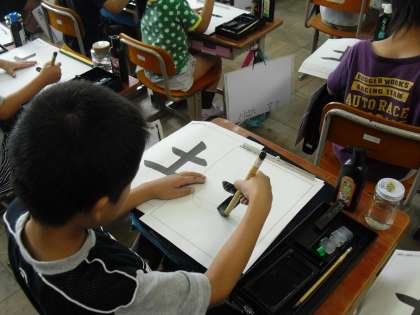 6月26日(水)今日は3回目の毛筆です。たてとよこの組み合わせで『土』をかきました。筆づかいに気をつけて書きました。