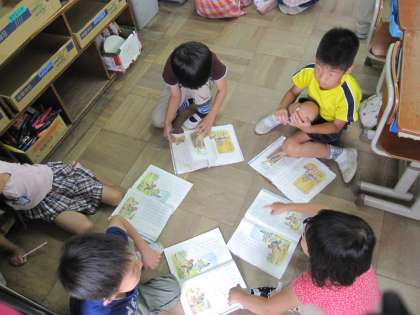 「おむすびころりん」を台詞のようにおじいさんやネズミになって本を読みます。それぞれのグループで役を決めて練習しています。