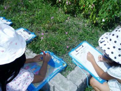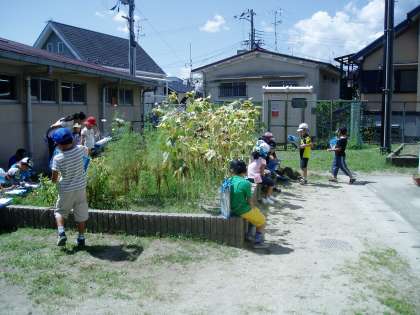 花壇のヒマワリ,ホウセンカ,オジギソウ,コスモスを観察しました。種のでき方の違いに驚いていました。