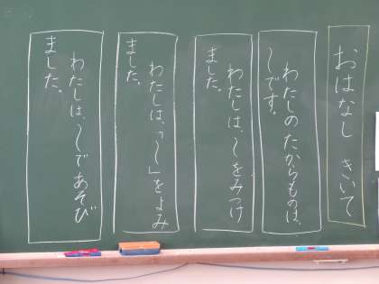 国語の「おはなし きいて」では,みんなに知らせる内容を決め,話す順序を考えながらカードを書いています。
