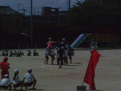 運動場から勇ましい声が聞こえます。5年生の団体競技「騎馬戦」の練習です。戦い方もそうですが、旗やハッピにもご注目ください。