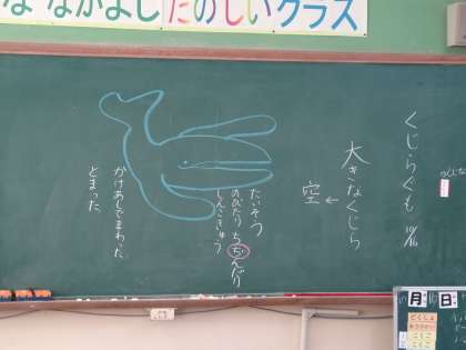 「くじらぐも」と子どもたちが出会う場面を,みんなで読みました。「おうい」「ここへ おいでよう」など,くじらぐもと子どもたちのかけ合いを楽しみながら音読をしました。