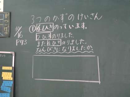 問題文の中の言葉から足し算か引き算かを考えて,ホワイトボードに図を描いている様子です。図を描いた後は,その図を使ってみんなの前で説明をしました。「まず」「つぎに」「また」など,順序が分かる言葉を使いながら,説明ができるようになっていってもらえればと思います。