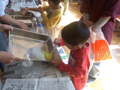 スライムづくり(放課後まなび室),ペットボトルキャップ投げ(こどもホール),ペットボトルボウリング(こどもホール)の様子です。