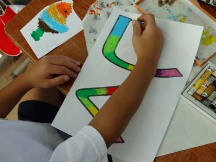 1年生は,なかよし運動会の入場門を作ることになっています。今日は,応援メッセージの文字と飾りの鳥の色塗りをしました。きれいな色を使って,色を塗りました。