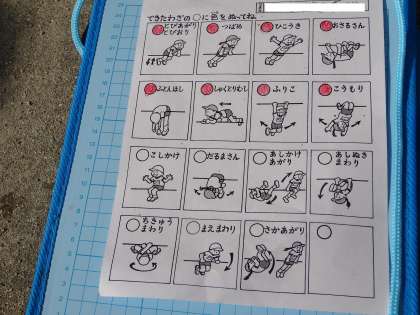 いろいろな技の挑戦しています。できたら,カードに印をつけていきます。「逆上がりができた!」と,嬉しそうに授業を終えた子もいました。小さいうちに,鉄棒の経験をしておくほうが,早く技を習得できるようになります。少しでも, いろんな技ができるようになってほしいと思います。近くの公園でも,練習してみてください。