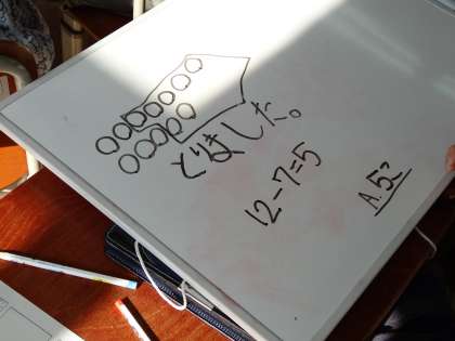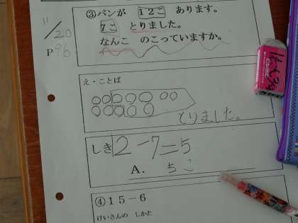 算数でひきざんの練習をしています。繰り下がりのひきざんは難しいようです。「10から引き,のこりを合わすという練習をしています。