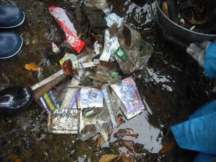 落ち葉にまじって,たばこの吸い殻や金属類,ガラスなども川底からみつかりました。環境を学習している4年生にとって今後の学習に活かしていけるよい体験ができました。