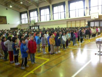 朝に朝会がありました。栄養教諭の牧村先生の紹介のあと,先日できた修学院小学校のルールブックをもとにした学校長の人権についての話が,クイズ等も交えながらありました。
