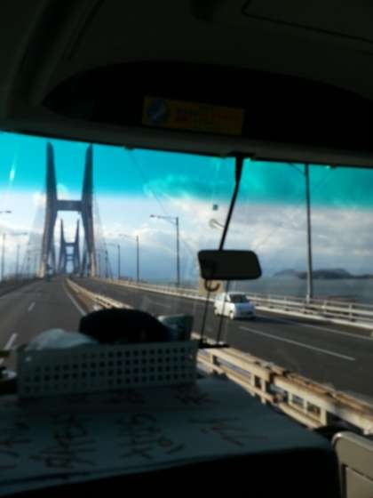 ホテル横の展望台から瀬戸大橋を眺めた後,バスで瀬戸大橋を渡っています。