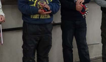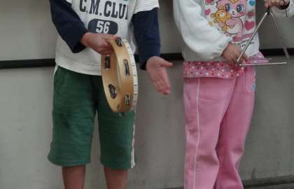教室にあるタンブリン・トライアングル・スズ・カスタネットを演奏しました。教科書のP46「すずめが ちゅん」という曲のすずめの鳴き声のところを工夫してリズムを入れました。「ちゅん ちゅん ちゅん」が4か所あるので,場所ごとに楽器を変えて演奏したので,子どもたちは楽器の音色の違いを感じ取っていたようです。