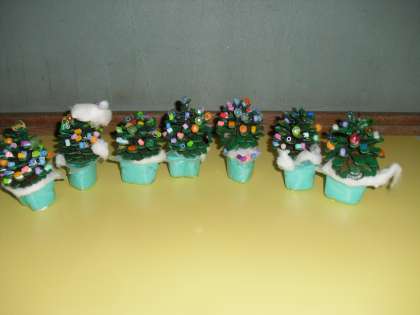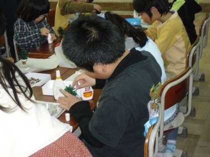 1年生と一緒に松ぼっくりツリーを作りました。緑色に塗られた松ぼっくりに、綿で雪のようにしてから、ビーズやスパンコールで飾りを付けました。ひまわりの子どもたちは、松ぼっくりツリーの作り方がよく分かっていてはやくきれいにできました。