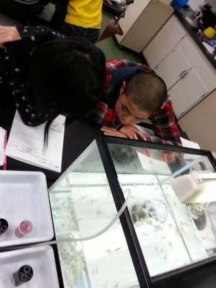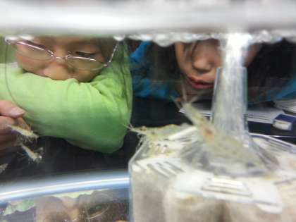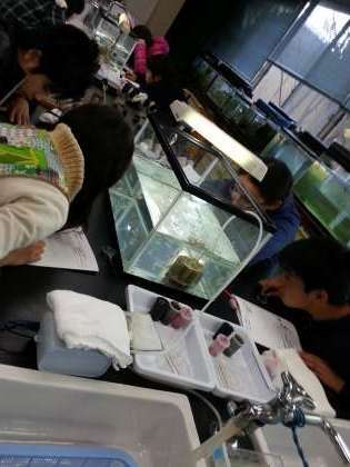 次は,エビにえさを与えて,どのように消化器官を通っていくのか観察します。「わー,体に入っていく!」「気持ち悪い〜」などの声が起こる中,みんなエビに集中しています。