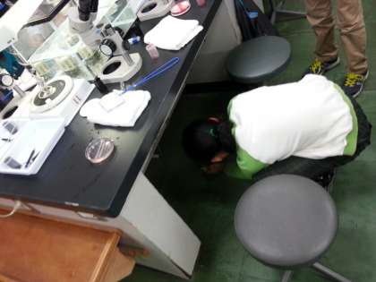 エビを筒にいれたら,次はBTB溶液をエビの周りに流し,エビが呼吸しているかどうか色変化で観察します。
