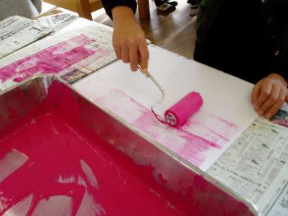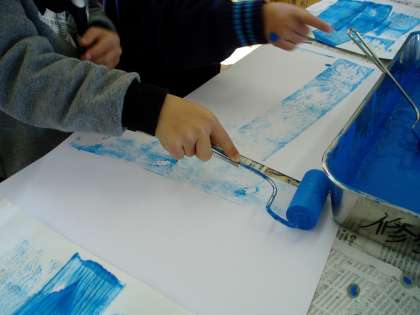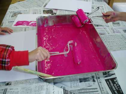 図画工作「いろいろペッタン」の様子です。ローラーで,背景の色をつけています。この上に,いろいろな形を移す活動をする予定です。