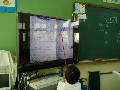 今まで学習したことの復習をしています。たし算やひき算・数の数え方など,指示棒を使って説明もしました。