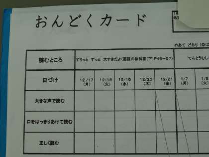音読の宿題を続けています。新しい単元になりました。頑張って読みましょう。たくさん読んでいるとなかみもよくわかってきます。冬休みも続けるといいです。