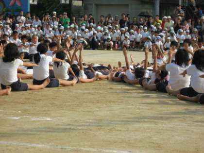 写真は,普段の授業の様子と運動会の6年生の組体操の様子です。