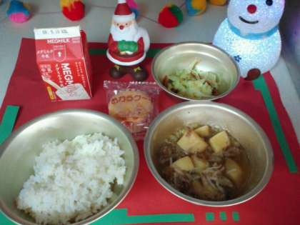 今日は、給食室にサンタさんとトナカイがやって来て、子どもたちにおからケーキを配ってくれました。子どもたちは大喜びでした!