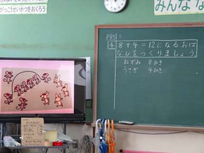 「あわせて」「ぜんぶで」や,「ちがいは」など今まで勉強してきた言葉を使って足し算や引き算の問題文を考えました。