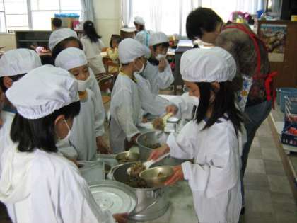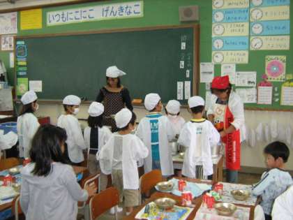 前期も終わりです。1年生も先生方と一緒に給食の準備ができるようになりました。今日もみんなと力を合わせて準備をして,みんなと一緒においしくいただきます。