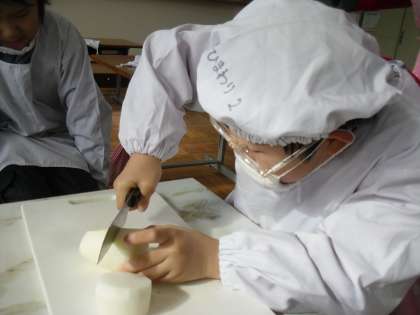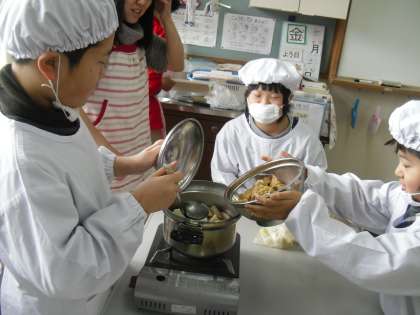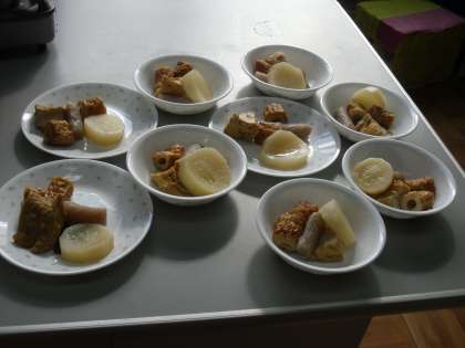 収穫した大根をおでんにしました。おでんに入れる大根以外の材料は2年生以上の児童が皆でスパーマーケットに行って買ってきました。大根は柔らかくおいしかったです。大根をおかわりして食べました。