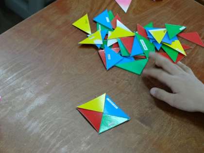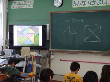 三角形の色板を使って,教科書の見本と同じ形を作ります。難しいようでしたが,楽しく活動できました。明日は,シルエットを見て,形づくりをします。