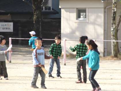今日は天気がよかったので,運動場で,羽根つきをしました。なかなか羽子板にあたりませんが,楽しく遊びました。