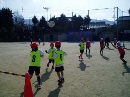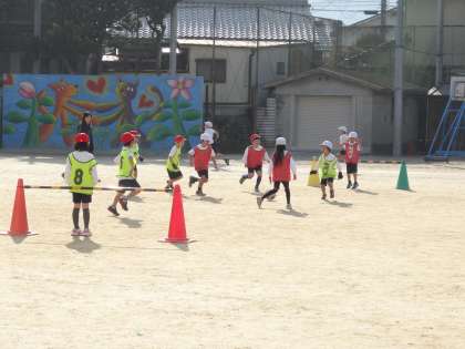 ボールけりゲームをはじめています。みんなが楽しくゲームに参加できるようにルールを工夫して取り組んでいます。