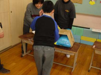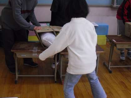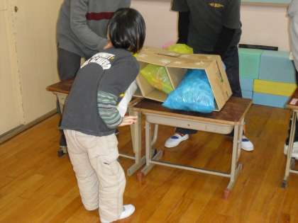 第2回巨匠展に向けて合同作品作りが修学院第二小学校で行われました。前回作った蛇の胴体を使って、わにわにパニックゲームをして交流しました。