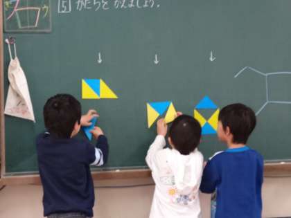 「かたちつくり」のおさらいをしています。△のカードを並べたり,動かしたりしてかたちを変えています。棒をつかった形もいろいろ練習しました。