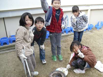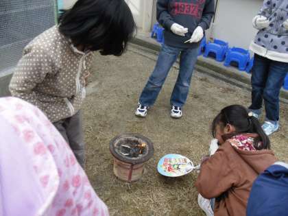 1月23日(木)この日は総合学習の『昔のくらしを体験しよう!』で七輪を使って炭でもちを焼きました。火をおこすのが大変でした。