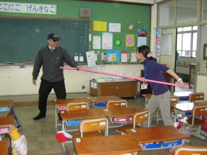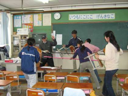 下鴨署の方に「不審者」になっていただき,子どもの避難のさせ方,不審者に対する対応の仕方などを教えていただきました。